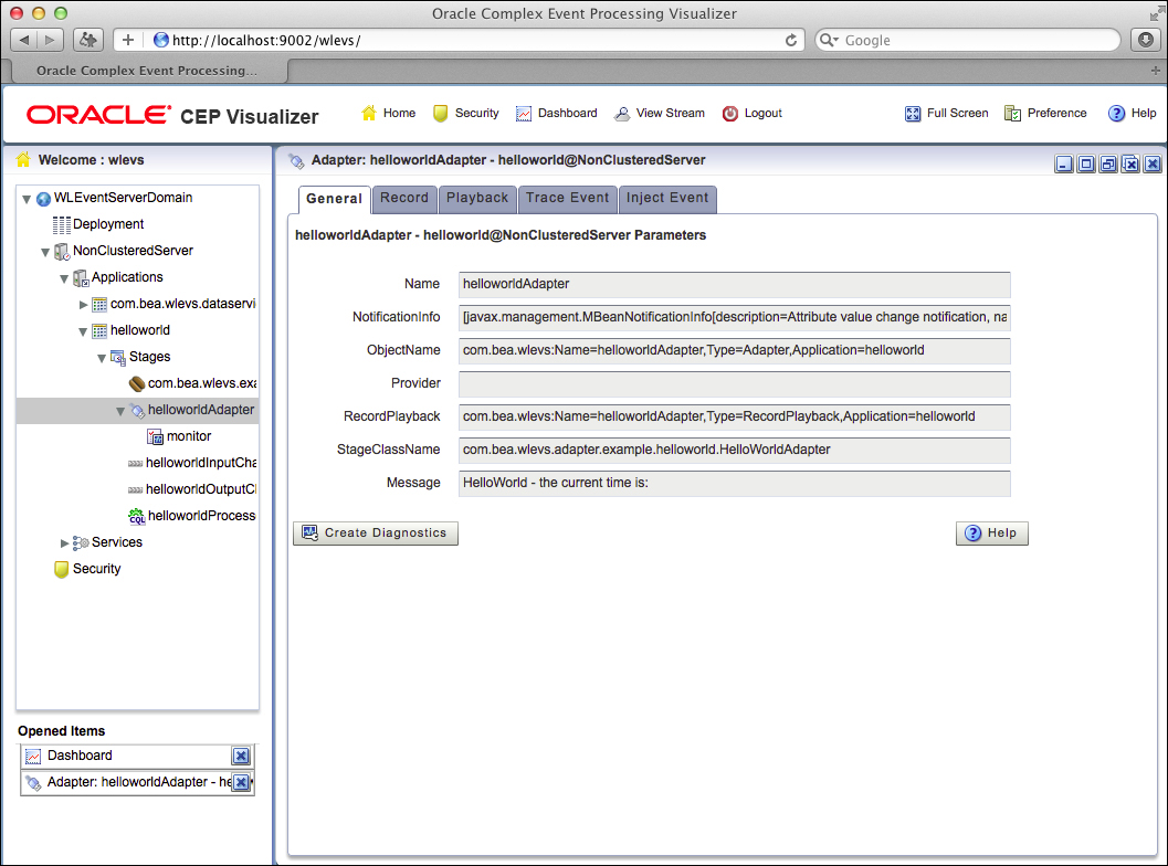 In the Visualizer, first select the application and the stage that you wish to monitor in the Domain Browser window. For example, let's select helloworldAdapter. Next, click on the Create Diagnostics button, which is shown in the following screenshot:
