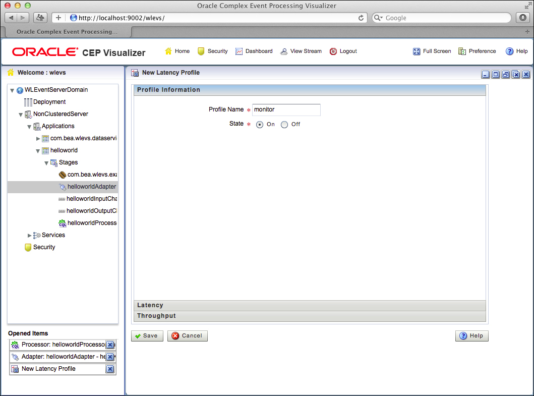 When you do this, a new panel with three sections named Profile Information, Latency, and Throughput shows up. In the Profile Information section, you need to give your monitoring profile a name, and optionally set the State option to On. Keep in mind that a profile can monitor both latency and throughput. Next, we show how to monitor latency: