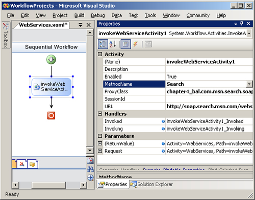 The InvokeWebService activity can call an external web service. When we drop the activity into the workflow designer, the familiar Visual Studio Add Web Reference dialog box will appear. This same dialog appears when we add a web reference to any type of .NET project in Visual Studio. We merely need to browse to a Web Service Definition Language (WSDL) document with the description of the web service. Visual Studio will retrieve the WSDL and generate a proxy class for the web service. We can then configure the activity with the method name to invoke, and bind parameters to fields or properties in our workflow (see the screenshot).