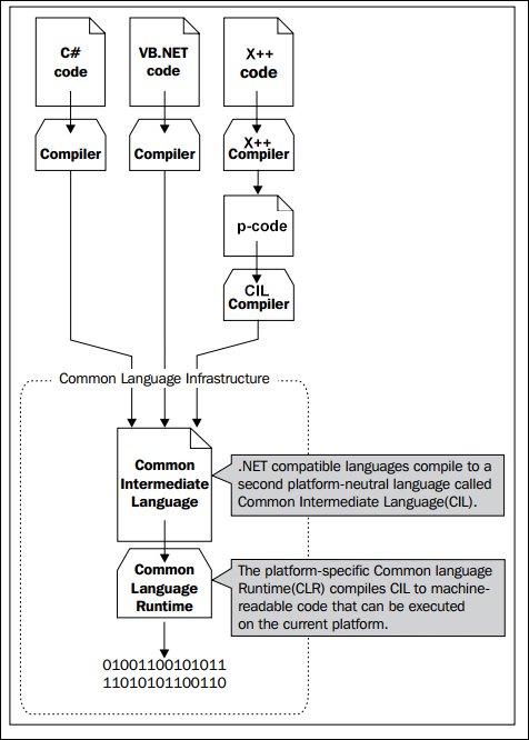 The following diagram shows that the languages are first compiled in CIL, after which the Common Language Runtime (CLR) compiles the platform-independent CIL code into machine-readable code: