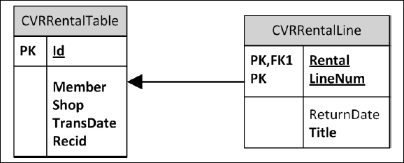 The following is a simple schema of the tables that we will use. A rental header contains information about the rental, such as the store and the transaction date. A rental header is related to one or more lines that contain the details of the rental, such as the item that was rented: