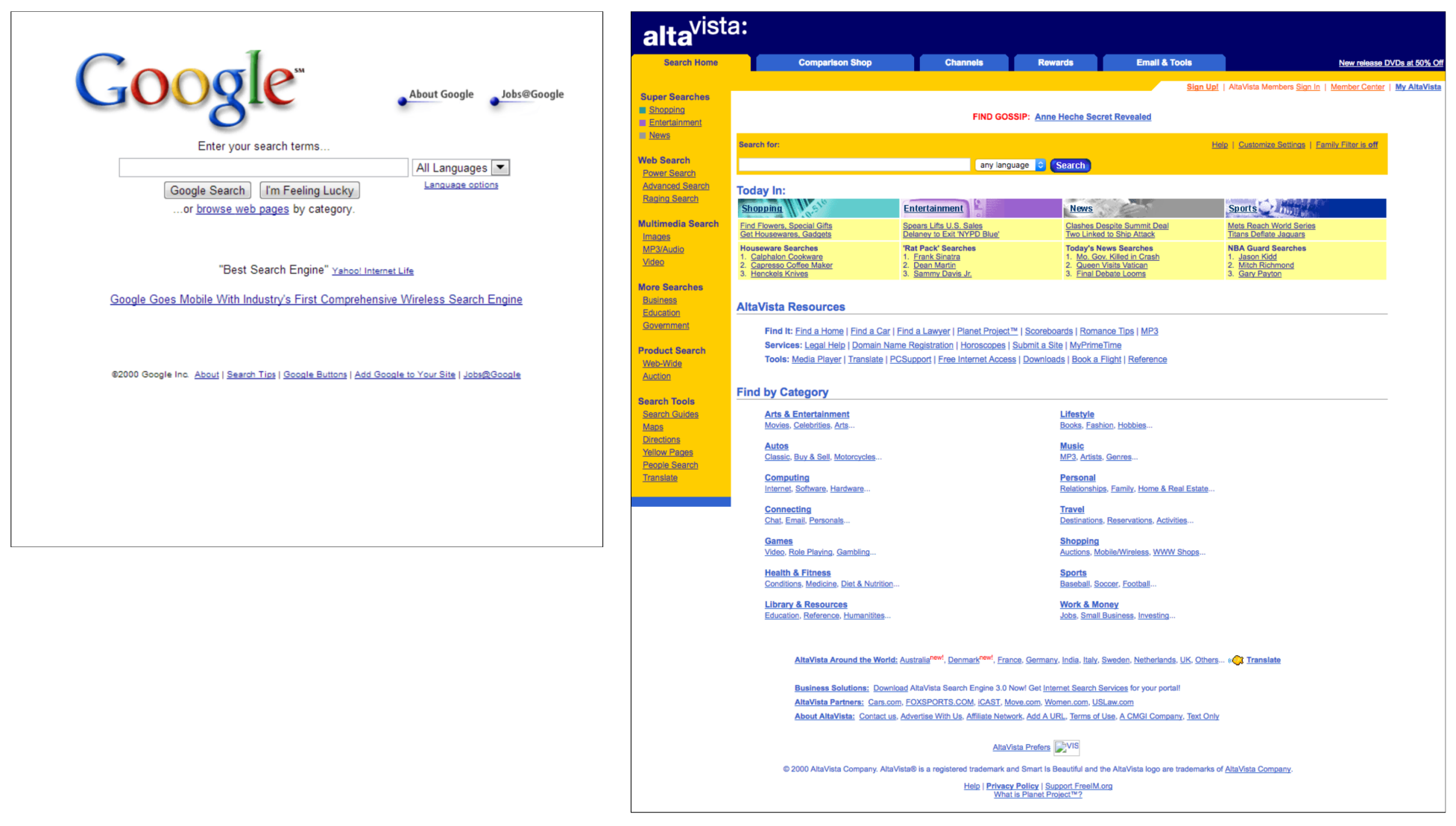 From the get-go, Google's search user experience offered a dramatic departure from prevailing conventions. Instead of a busy screen saturated with links, the user was presented with an almost empty, pristine white screen that featured a single search field and two buttons: Google Search and I'm Feeling Lucky.