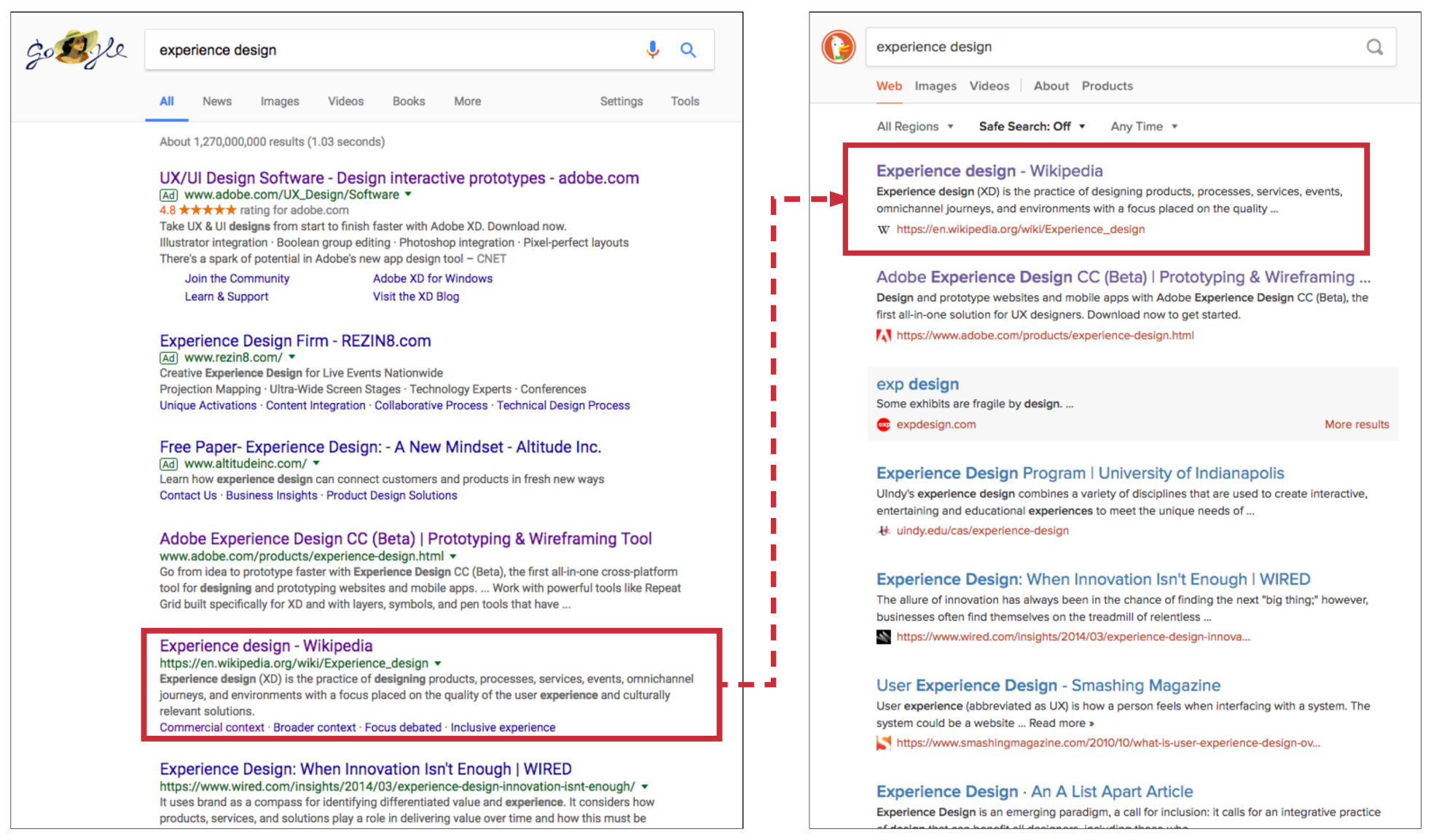 As illustrated in preceding screenshot, searching experience design with DuckDuckGo places the link to Wikipedia at the top of the search results page. Isn't this experience better than Google's?