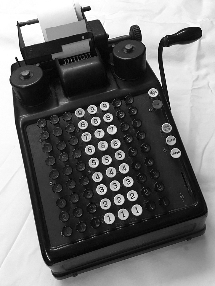 The preceding photo shows William S. Burroughs' (1855-1898) adding machine. The invention of the adding machines was aimed to accommodate human inability to memorize numbers and to take manually laborious tasks off our hands. In 1886, William S Burroughs founded the American Arithmometer Company. His first U.S. patent was a nine-digit keyboard and a printing mechanism that would print out the total of the computation, with the original model selling for $475. All machines were crank-operated until the first electric models were introduced in 1928. By 1935, the company produced 350 different models of adding machines, both electronic and non-electric. Adding machines and typewriters answered specific human tasks at the time that our computers have now fully taken off our hands through software programs and computation.
