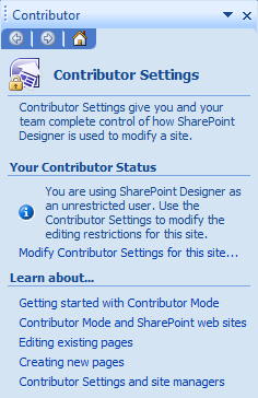 You will notice that the task pane tells us that we have unrestricted contributor status. This status allows us to specify the contributor settings for our site, controlling which users can modify the different parts of our site.