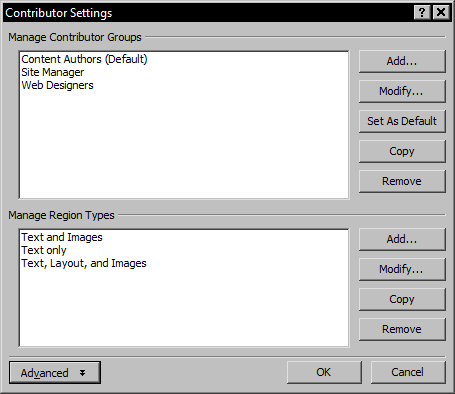 Click on the Modify Contributor Settings for this site... link to bring up the Contributor Settings dialog. Here, we see that there are two categories we can manage: