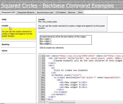 The result is a Backbase Command Functions Exerciser. The following screenshot shows it for the create command example: