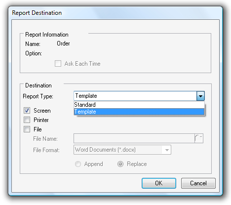 Users who are familiar with versions prior to GP 2010 may be surprised to see a new feature when printing certain reports in GP 2010. As seen in the Report Destination window image below, users are now given a choice of selecting a Report Type of Standard or Template.