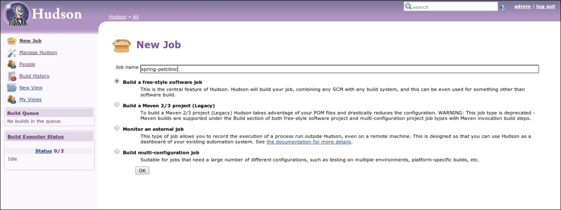 We will create a free-style software job by clicking on the New Job link on the left pane of the Hudson home page. The value for Job name is spring-petclinic. The screenshot is shown as follows:
