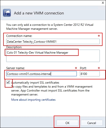 In the pop-up dialog box, provide a Connection Name, Description, Server name, and a Port for VMM communication. Ensure that you select Automatically import SSL certificates. Then click on the OK button as shown: