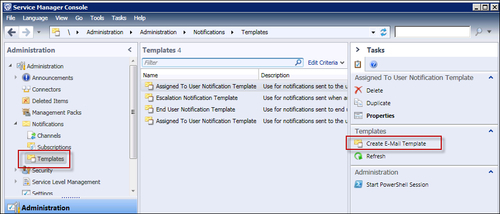 Navigate to SCSM Console | Administration | Notifications | Templates and select Create E-Mail Template from the Tasks workspace: