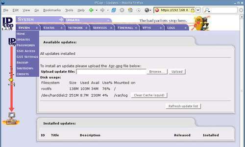 The Refresh update list button connects to the IPCop servers and retrieves a list of released updates—the Available updates portion of the page will indicate when there are updates that need to be supplied, and provide a download link. The updates must be manually downloaded as-is (not unpacked or extracted) from the Internet and then uploaded (via the Browse button) to the firewall.