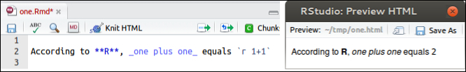 A very important feature of reproducible science is generating reports. The main idea of automatic report generation is that the results of analyses are not manually copied to the report. Instead, both the R code and the report's text are combined in one or more plain text files. The report is generated by a tool that executes the chunks of code, captures the results (including figures), and generates the report by weaving the report's text and results together. To achieve this, you need to learn a few special commands, called markup specifiers, that tell the report generator which part of your text is R code, and which parts you want in special typesetting such as boldface or italic. There are several markup languages to do this, but the following is a minimal example using the Markdown language:
