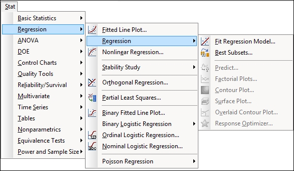 The regression tools in Minitab cover the very simple studies with a single predictor, fitted line plot, or the assistant regression tools, up to the very complex ones, such as nonlinear regression. This chapter starts with a fitted line plot and works through multiple regressions, logistic regression, and finally, nonlinear regression tools.