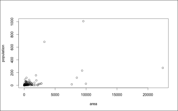 In our example, we want to estimate the population of a country starting from its area. First, let's visualize the data about the area (in thousand km2) and the population (in millions), as shown in the following figure: