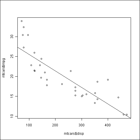 plot(mtcars$mpg~mtcars$disp) lmfit<-lm(mtcars$mpg~mtcars$disp) abline(lmfit)