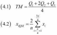 We can measure central tendency with the mean and median. These measures use all the data available. It is a generally accepted idea to get rid of outliers by discarding data on the higher and lower end of a data set. The truncated mean or trimmed mean, and derivatives of it such as the interquartile mean (IQM) and trimean, use this idea too. Take a look at the following equations: