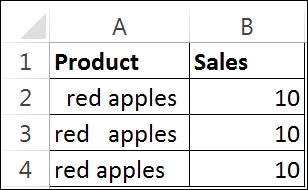 Another important fact about this data is that I added two extra spaces to cells A2, A3, and A4. In cell A2, I added the spaces before the word red. In cell A3, I added the spaces in between red and apples. In cell A4, I added the spaces after the word apples.
