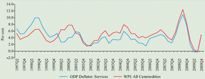 The answer is that we need to understand and explore the relationship between multiple time series as this can improve our forecast. For example, we have got correlated time series of GDP Deflator: Services and WPI: All Commodities, as follows: