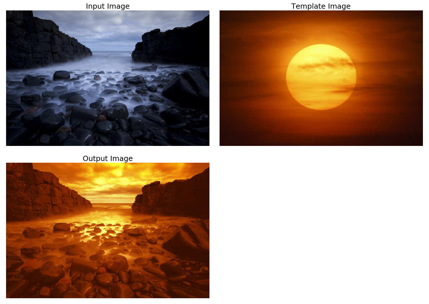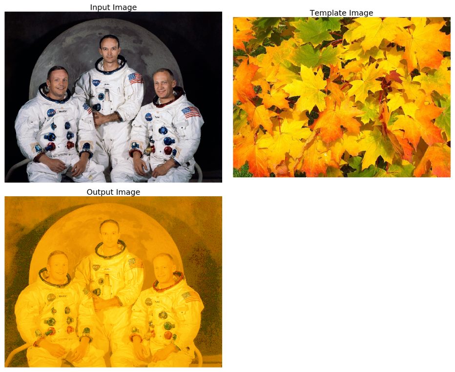 - Finally, read the input and template images, compute their cdfs, and create the output image with the hist_matching() function. Plot the input, template, and output images by running the following code: