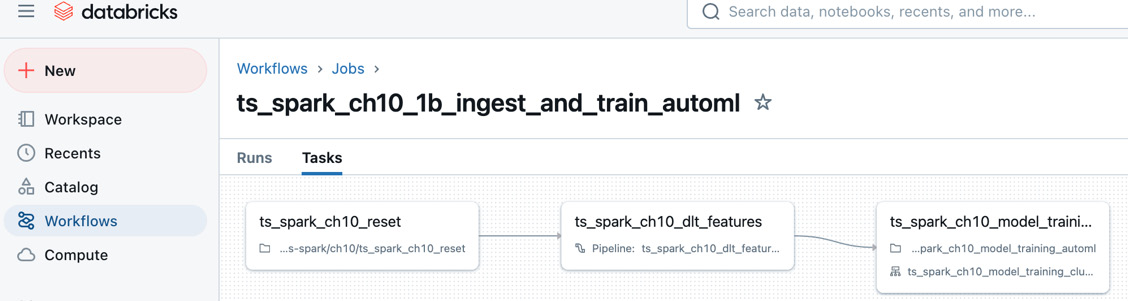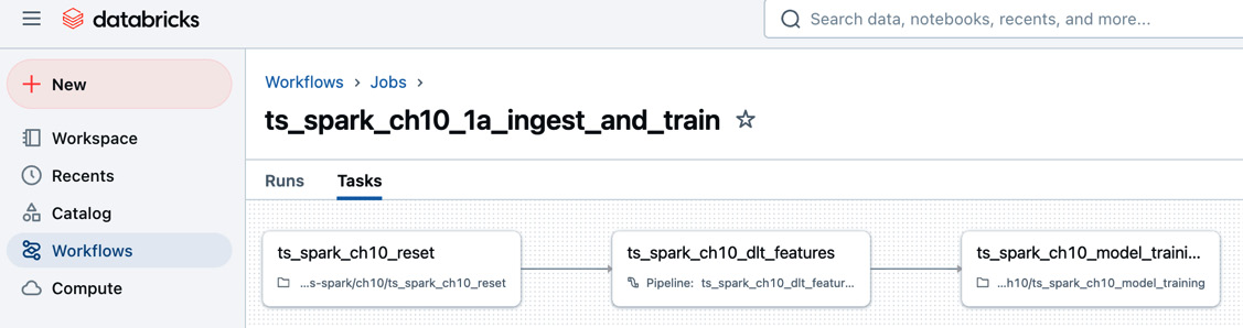 The code example in this chapter includes four workflows. These are implemented as jobs in Databricks. The best way to visualize the jobs is from the Workflows > Jobs > Tasks views in Databricks, as per Figures 10.1, 10.2, 10.3, and 10.4.
