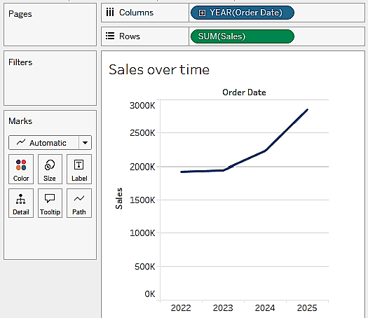 Sales field from the Data pane to Rows. This gives you a single, vertical bar representing the sum of all sales in the data source.Order Date field from the Data pane to Columns. Tableau has a built-in date hierarchy, and the default level of Year has given you a line chart connecting four years. Notice that you can clearly see an increase in sales year after year: