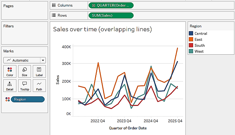 Region field from the Data pane to Color. Now you have a line per region. Each line is a different color, and a legend indicates which color matches each region. As in the stacked bars example, adding a dimension to Color splits the marks. However, unlike the bars, where the segments were stacked, the lines are not stacked. Instead, the lines are drawn at the exact value for the sum of sales for each region and quarter. This allows easy and accurate comparison. It is interesting to note that the cyclical pattern can be observed for each region: