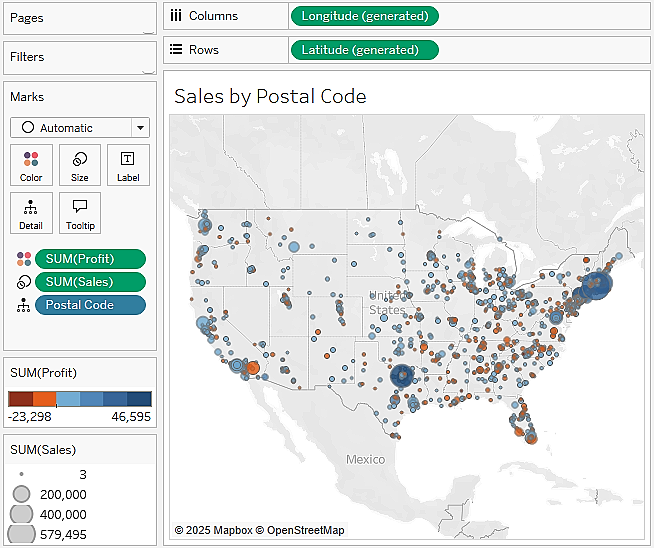 Postal Code in the Data pane. Tableau automatically adds Postal Code to Detail on the Marks card and Longitude (generated) and Latitude (generated) to Columns and Rows. The mark type is set to a circle by default, and a single circle is drawn for each postal code at the correct latitude and longitude.Sales from the Data pane to the Size shelf on the Marks card. This will resize each circle based on the total sales for that postal code.Profit from the Data pane to the Color shelf on the Marks card. This encodes the mark color to correspond to the sum of profit. You can now see the geographic location of profit and sales at the same time. This is useful because you will see some locations with high sales and low profit, which may require some action.The final view should look similar to the following (note that some fine-tuned adjustments have been made to the size and color):