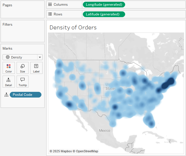Let’s say you want to understand the geographic concentration of orders. You might create a density map using the following steps: