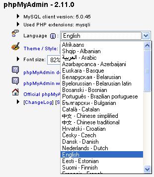 A Language selector appears on the login panel (if any) and on the Home page. The default behavior of phpMyAdmin is to use the language defined in our browser's preferences, if there is a corresponding language file for this version.