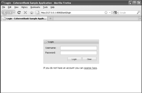 If the browser does not open automatically, make sure that you have specified the correct browser location in the build.properties file, or open the browser manually and navigate to http://localhost:8080/bank/login.
