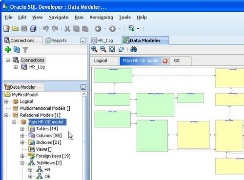 SQL Developer 2.1 includes the Data Modeler Viewer extension. This viewer provides users with the option of opening existing SQL Developer Data Modeler diagrams or creating models based on the database connection. To open the Data Modeler in SQL Developer, select Tools | Data Modeler. This opens the Logical and Relational model tabs. Once open, you can open any data model created in the Data Modeler. To review the details of the model in the navigator, select View | Data Modeler | Browser.