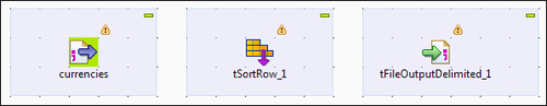 Right-click on the currencies delimited input and, using Row | Main, connect it to the sort component. Similarly, right-click on the sort component and use Row | Main to connect it to the delimited output component.