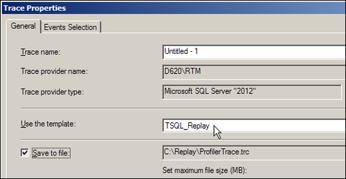 TSQL_Replay has been chosen as the trace template. Here, the output file has been created in C:\Replay\ProfilerTrace.trc to keep this example straightforward, but it would normally be placed...