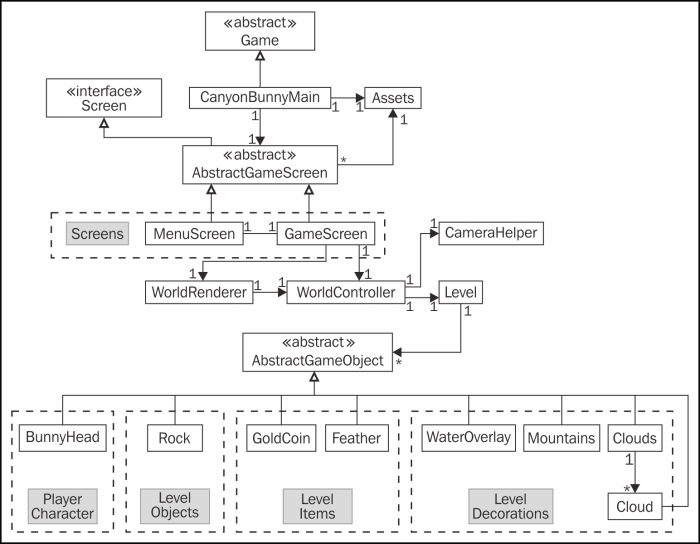 You might want to take a peek at the previous class diagram of Canyon Bunny for a quick refresher. See Chapter 3, Configuring the Game for the diagram.