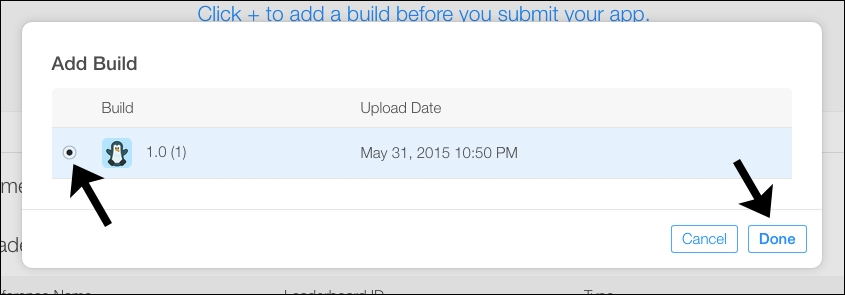 Use the radio button to select the archive you just uploaded, then click Done, as shown here. It can take a few minutes (or sometimes hours) for the uploaded build to show in this list: