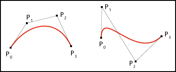 As you can see, the red line goes from point P0 to P3. However, the line is influenced in the direction of the control points, P1 and P2.