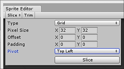 In Sprite Editor, click on Slice in the top-left corner of the window.