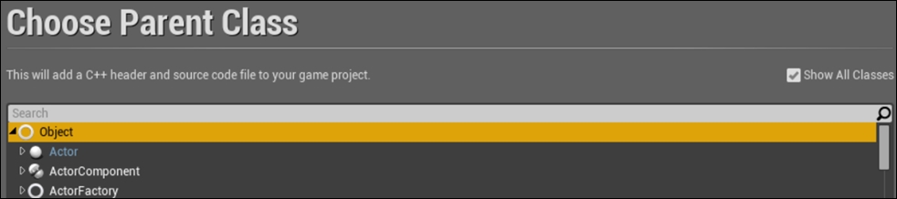 Create a new class using the editor. Unlike previous chapters, we are going to create an Object-based class. Object isn't visible in the default list of common classes, so we need to tick the Show all classes button in the editor UI, then select Object. Call your new Object subclass TileType.