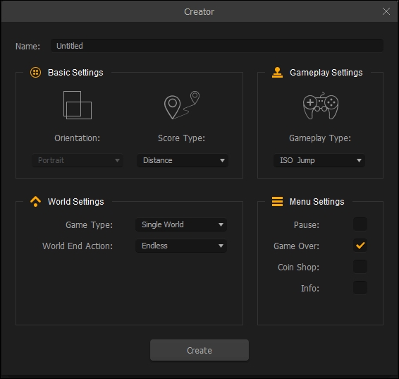 The initial setup for an ISO game is simple. When you're setting up your game, just choose either ISO Jump or ISO Jump Slide from the Gameplay Settings area of the Creator screen, as shown in the following screenshot: