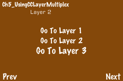 The CCLayerMultiplex class provides functionality to seamlessly switch between multiple layers. In this example, we have three similar layers assigned to a multiplex layer. Each layer displays buttons used to switch to any of the other layers.