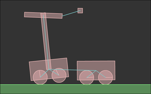 The siege machine consists of two carts mounted on wheels. The first cart can be controlled by the player and acts as a truck tractor. The second cart is just a trailer but has something between a trebuchet and a morning star mounted on it.