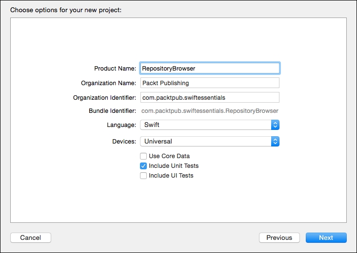 The RepositoryBrowser client will be created from the Master Detail template. This sets up an empty application that can be used on a large device with a split view controller or a navigator view controller on a small device. In addition to this, actions to add entries are also created.