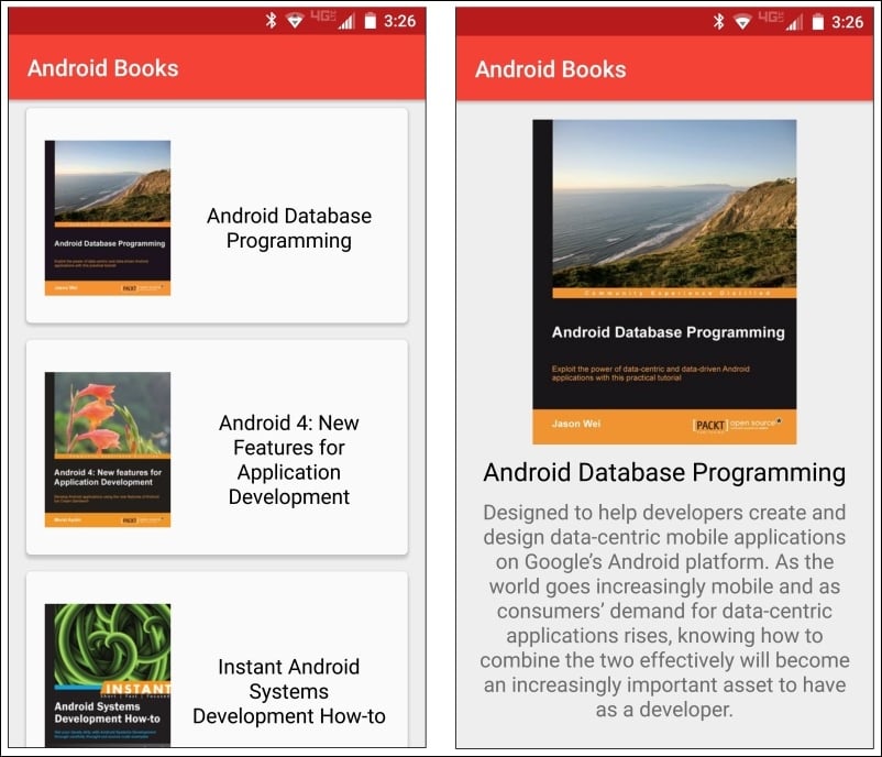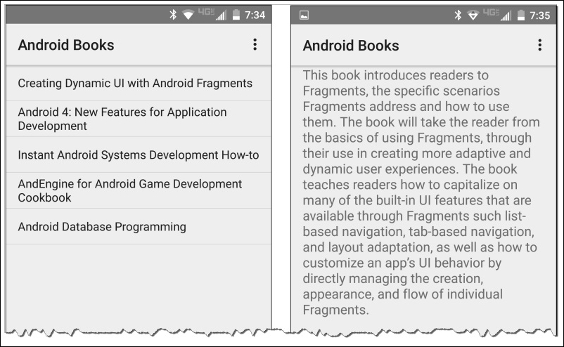 Throughout this chapter, we'll work with the version of our Android Books app that we completed in Chapter 4, Working with Fragment Transactions. As you'll recall, this is the version of our app that shows a list of books on one fragment, allows the user to select a book from this list, and then shows the detail for the selected book on another fragment. To refresh your memory, the app appears as shown in the following screenshot: