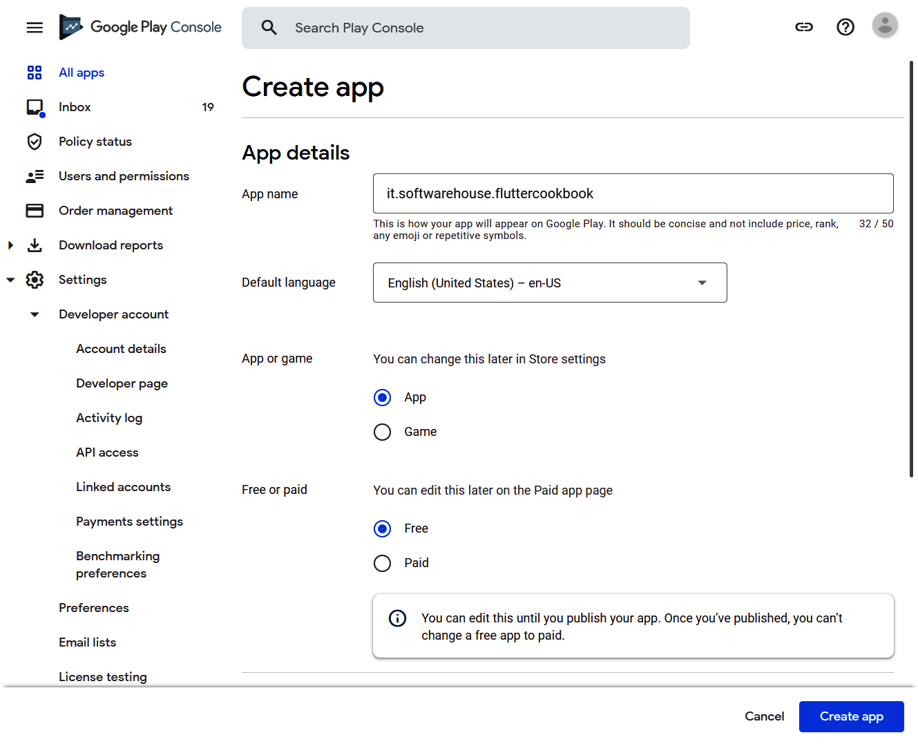 - On the Create app page, choose an app name and default language and select whether this is a game or an app and whether it's free or paid. Then accept the required policies and click the Create app button.