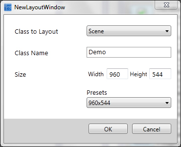 In the NewLayoutWindow dialog box, set Class to Layout to Scene, Class Name to Demo, and for Size select 960x544 (the PlayStation Vita's resolution), then click on OK: