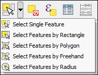 The first group of tools in the Attributes toolbar allows us to select features on the map using the mouse, either one at a time or by drawing different shapes such as rectangles or freehand areas around the features. All features that intersect with the drawn shape are selected. Holding down Ctrl will add the new selection to an existing one.