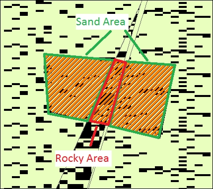 To calculate the cost of removing a particular soil type, we need to first find the underlying soil feature intersecting the excavation. Then we find the intersecting area between the excavation feature and the soil feature, calculate the area, and multiply it by the depth of the excavation. This will give us the total volume of the excavation. We then query the removal cost table to find the cost of removing the 1 m3 of that particular soil and then multiply it by the excavation volume. Note that an excavation might pass between two soil type areas, which will result in multiple intersections from different soil types. Take a look at the following example drawing: