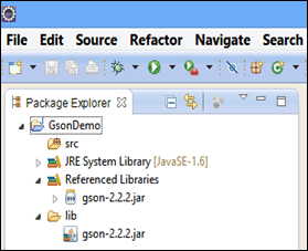 The preceding screenshot shows that the gson library is added to the Java project. Now, the GSON JAR file is listed in the Referenced Libraries.