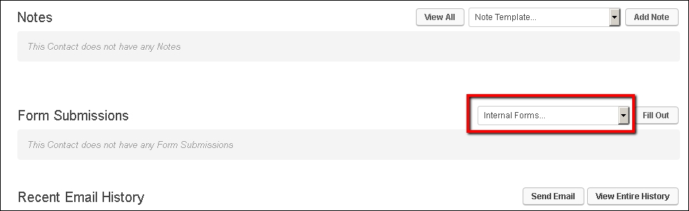 In the Form Submissions section, select the form we need to submit on the Internal Forms... dropdown and click on the Fill Out button: